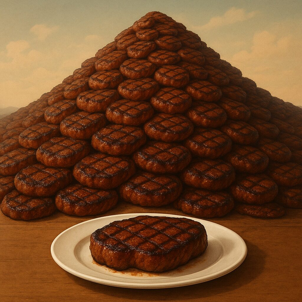 - これはステーキにすると 約6億枚/日、1年間では 2,190億枚 という非現実的な量に相当します。