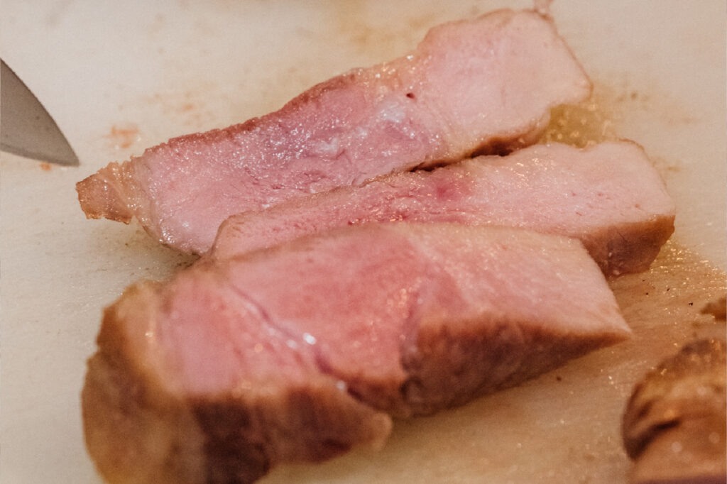 個人的には中心温度58℃が最もバランス良く、ジューシーさと柔らかさが両立できるおすすめの温度です。ヒレ肉など脂肪が少ない赤身肉の場合は、56℃くらいまで下げてレアに近い仕上がりにすることもあります。